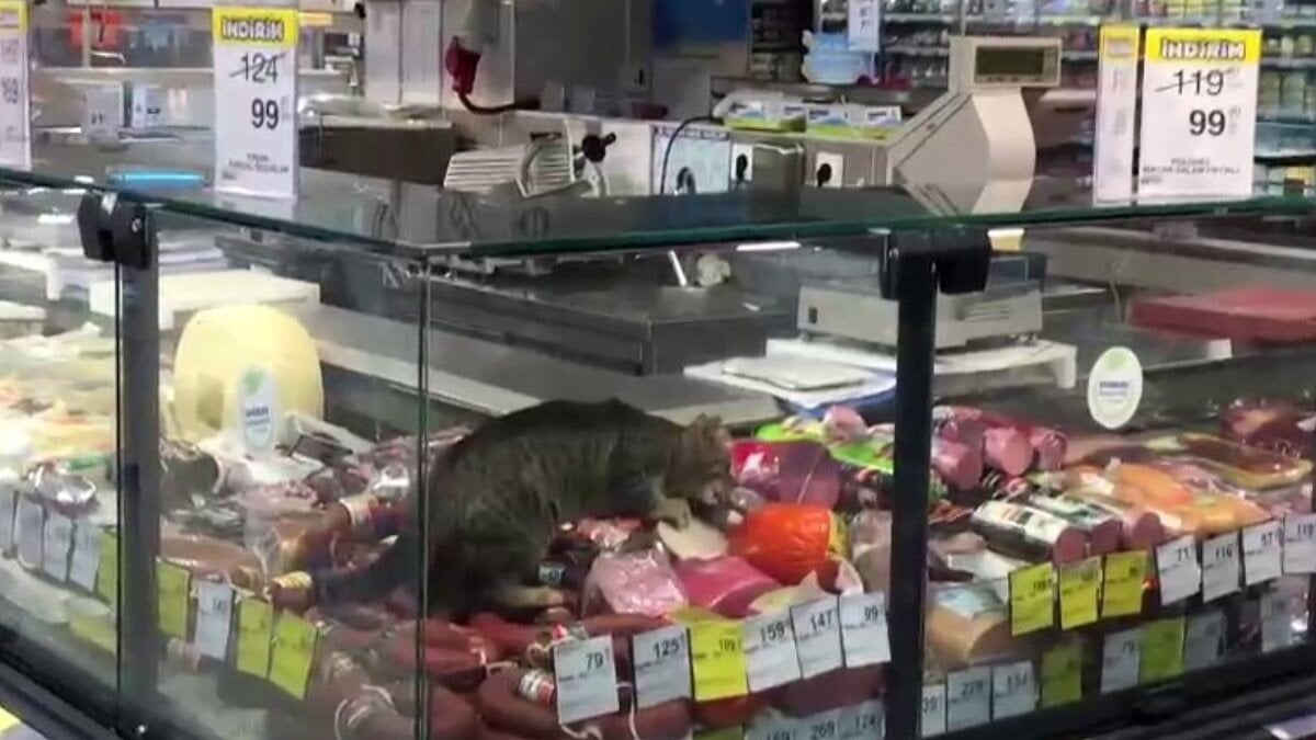 Bir kedinin şarküteri reyonunda, etlerin üzerinde gezinip karnını doyurduğu anları gören müşteri, cep telefonu kamerasını açarak o anları kayıt altına aldı.