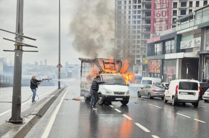 Sürücü, aracında çıkan alevleri fark edince hemen araçtan indi. Ancak hareket halindeki kamyonet, park halindeki başka bir kamyonete çarparak ancak durabildi.