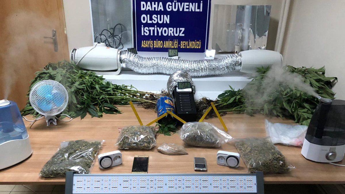 Yapılan aramalarda saksı ve poşetler içerisinde yetiştirilmiş 19 kök Hint keneviri, 5 kilo 250 gram esrar, 230 gram eroin, uyuşturucu yetiştirilmesi için kullanılan 2 termometre, iklimlendirme LED cihazı, koku giderici 2 havalandırma filtresi ve reflektörler ele geçirildi.