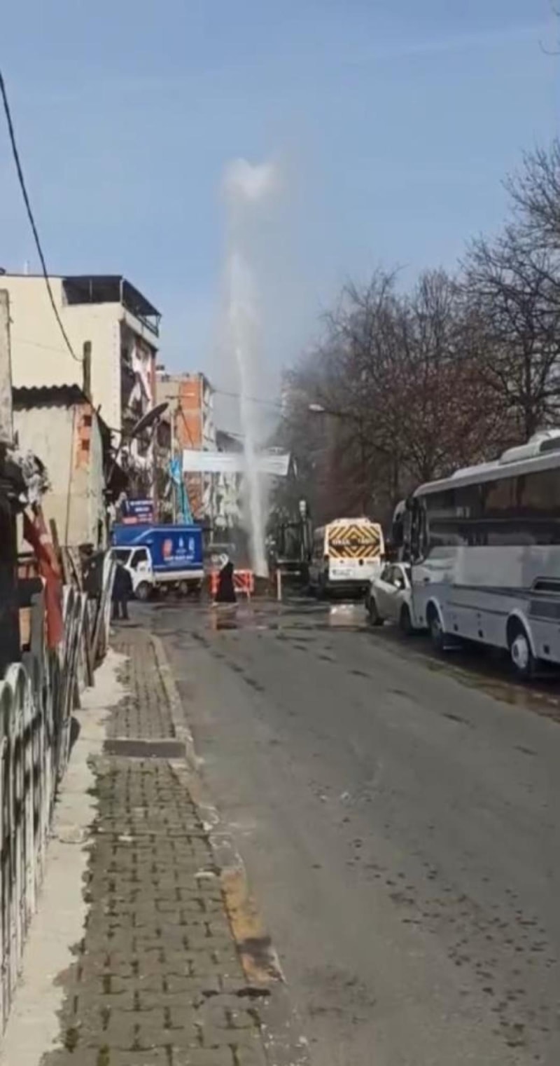 Beyoğlu'nda İSKİ ekiplerinin yolda çalışma yaptığı sırada kazı yapılan yerdeki isale borusu patlarken, borudan yaklaşık 10 metre yükselen tazyikli su, binaların boyunu aştı.