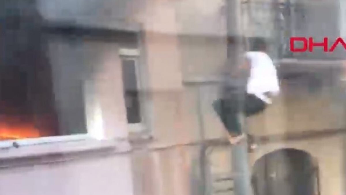 Yangında mahsur kalan bir kişinin aydınlatma direğine tutunup, aşağıya kayarak kaçma anları kameraya yansıdı.