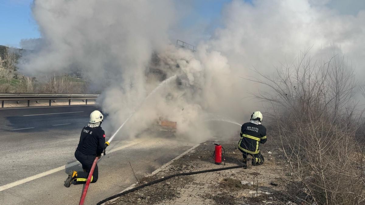 Eskişehir-Bilecik-Sakarya karayolu üzerinde seyir halindeki Osman A. idaresindeki silis kum yüklü tır, Bilecik Şehirler Arası Otobüs Terminali'ne gelmeden arka sağ tekerliği tutuşmaya başladı.