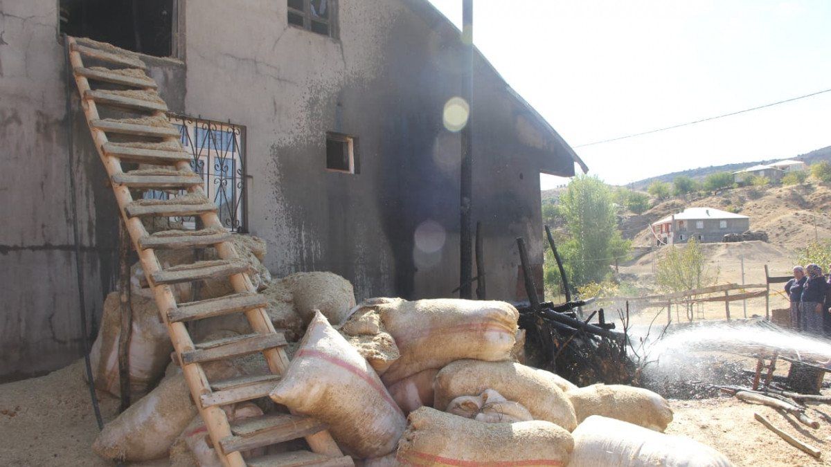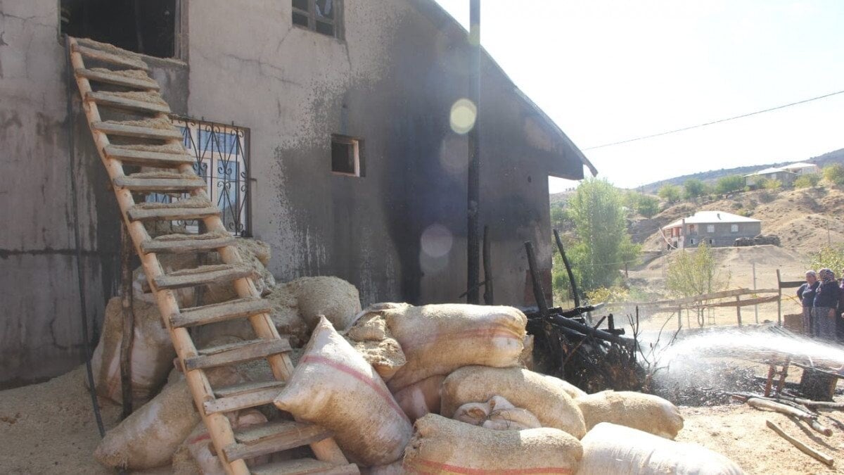 2 kardeşin kış öncesi çatıda stokladığı kışlık erzak ve 3 ton saman yanarken, çatılar kullanılamaz hale geldi. İtfaiyeciler, yangının çıkış nedenini araştırıyor.