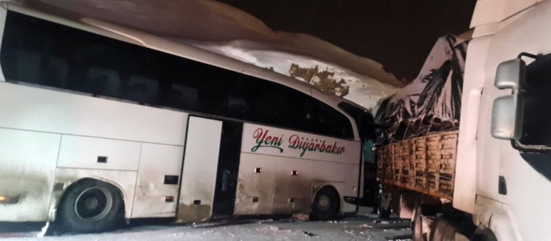 Bingöl’de buzlanma nedeniyle kontrolden çıkarak yol ortasında yan duran TIR’a yolcu otobüsünün çarpması sonucu 3 yolcu yaralandı.