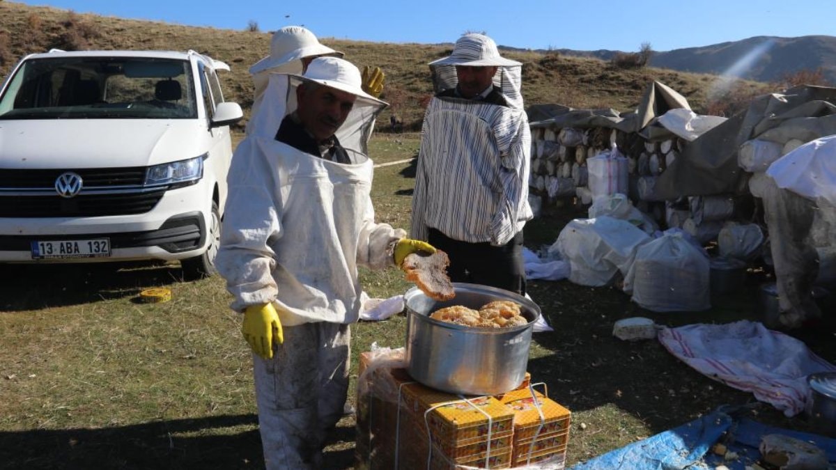 Bitlis'in Hizan ilçesinde bazı vatandaşlar, karakovan balının hasadı için kolları sıvadı.
