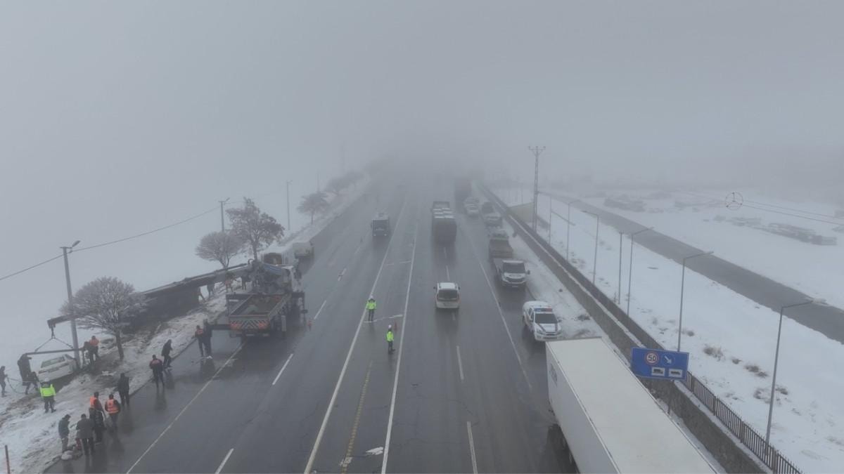 Yoğun sis ve buzlanmanın nedeniyle kazaların yaşadığı Rahva bölgesindeki son durum ve araçların kaldırılma çalışmaları drone ile havadan görüntülendi.