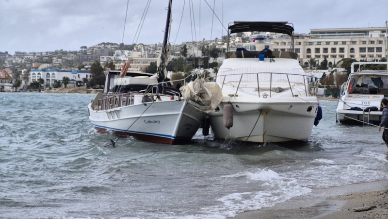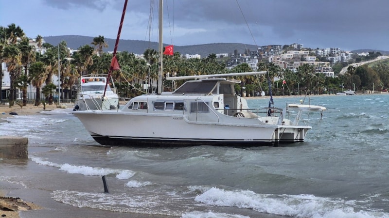 Fırtına sebebiyle Gümbet Koyu'nda demirli tekneler kıyıya sürüklendi.