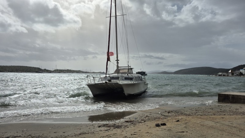 Muğla'nın Bodrum ilçesinde etkili olan fırtına nedeniyle koyda demirli toplam 8 tekne kıyıya sürüklenirken panik dolu anlar cep telefonu kamerasına yansıdı.