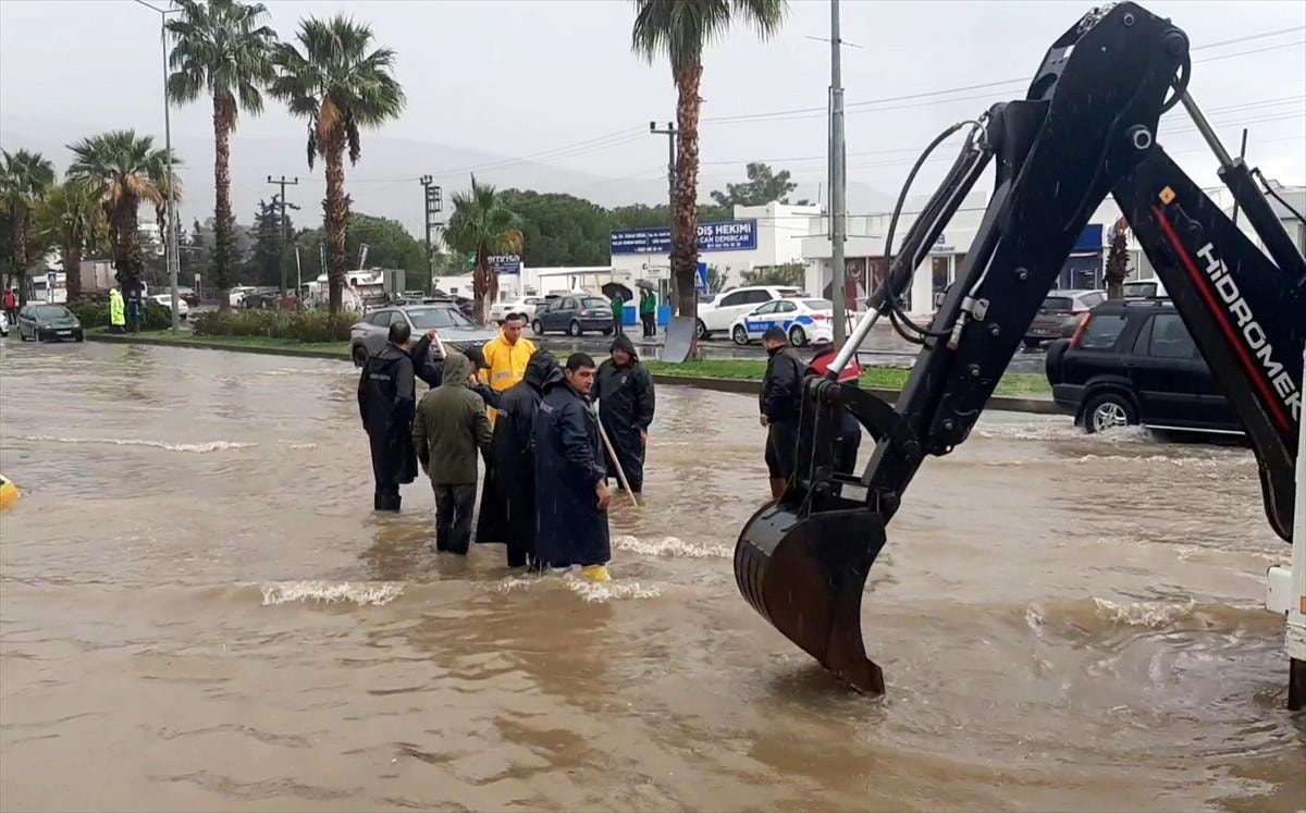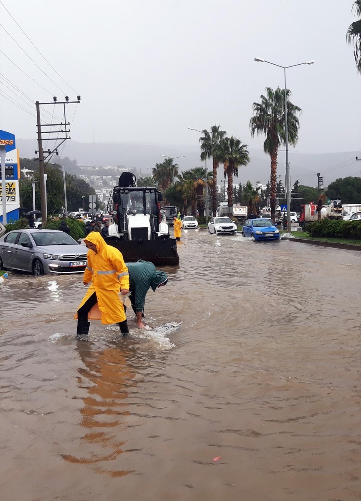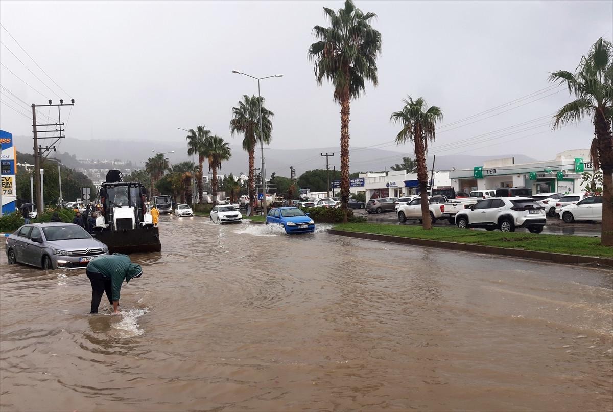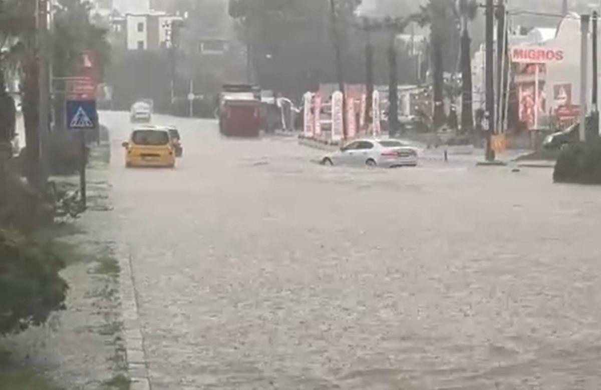 Bodrum ilçesinde bugün başlayan sağanak yağmur, kısa sürede kentte su baskınlarına neden oldu.