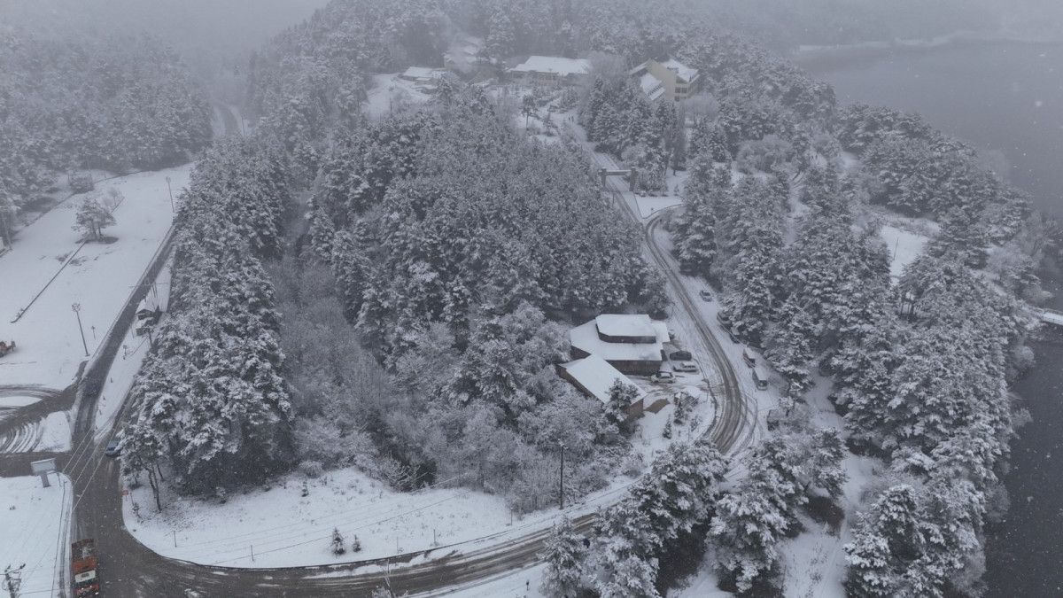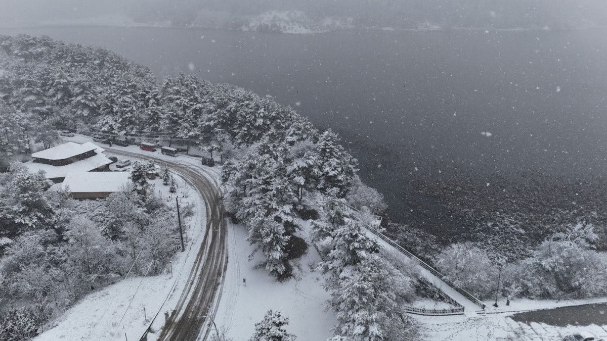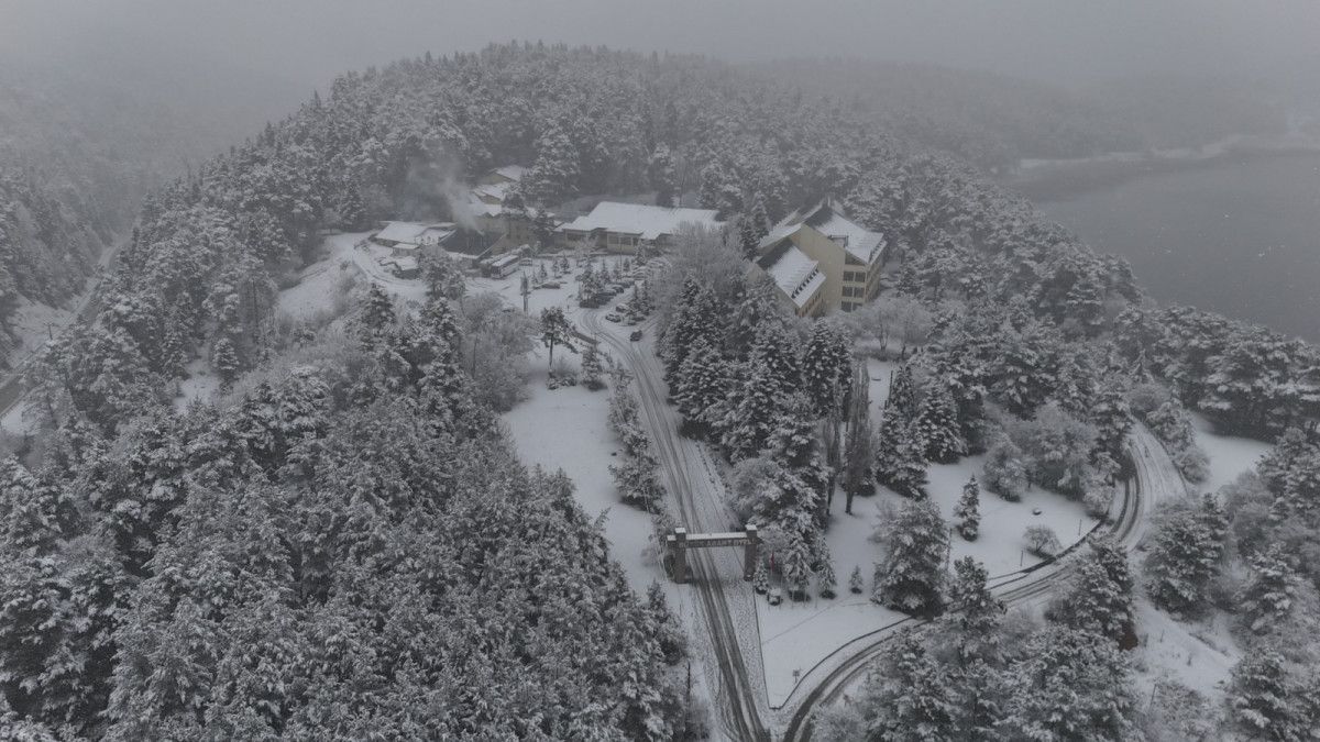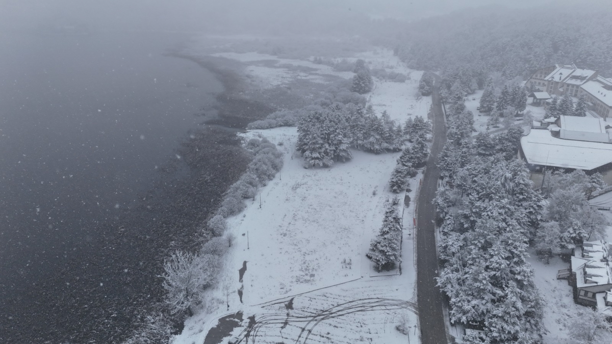 Kar kalınlığının yaklaşık 10 santime ulaştığı Abant'ta eşsiz manzara oluştu. Milli parkın karla kaplı görüntüsü drone ile görüntülendi.