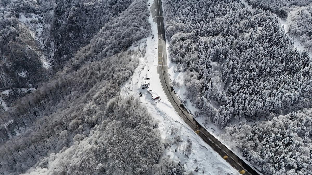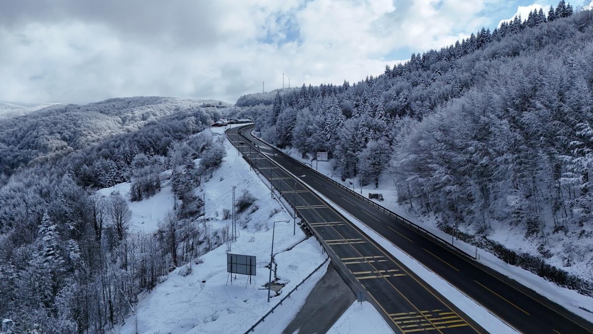 Çam ormanlarıyla kaplı Bolu Dağı'ndaki yeşil görüntü, karla birlikte beyaz güzelliğe dönüştü. Bölge, drone'la havadan görüntülendi.