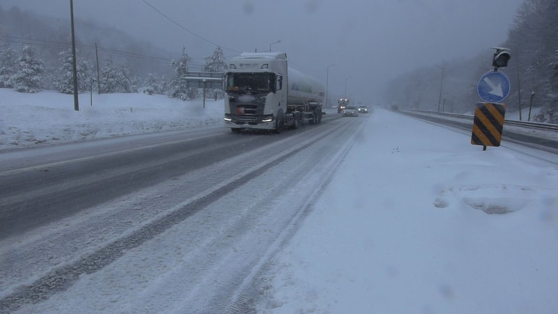 Bolu Dağı geçişinde kar yağışı sürüyor. Karayolları ekipleri kar küreme çalışmaları nedeniyle Düzce tarafından Bolu yönüne ağır tonajlı araçların geçişini bir süre durdurdu.