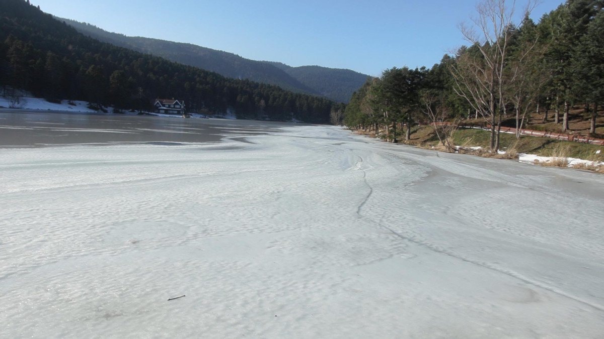 Eşsiz manzarasıyla dikkat çeken 1217 metre rakımlı tabiat parkındaki 4,5 hektar büyüklüğündeki gölün yüzeyi tamamen buzla kaplandı.
