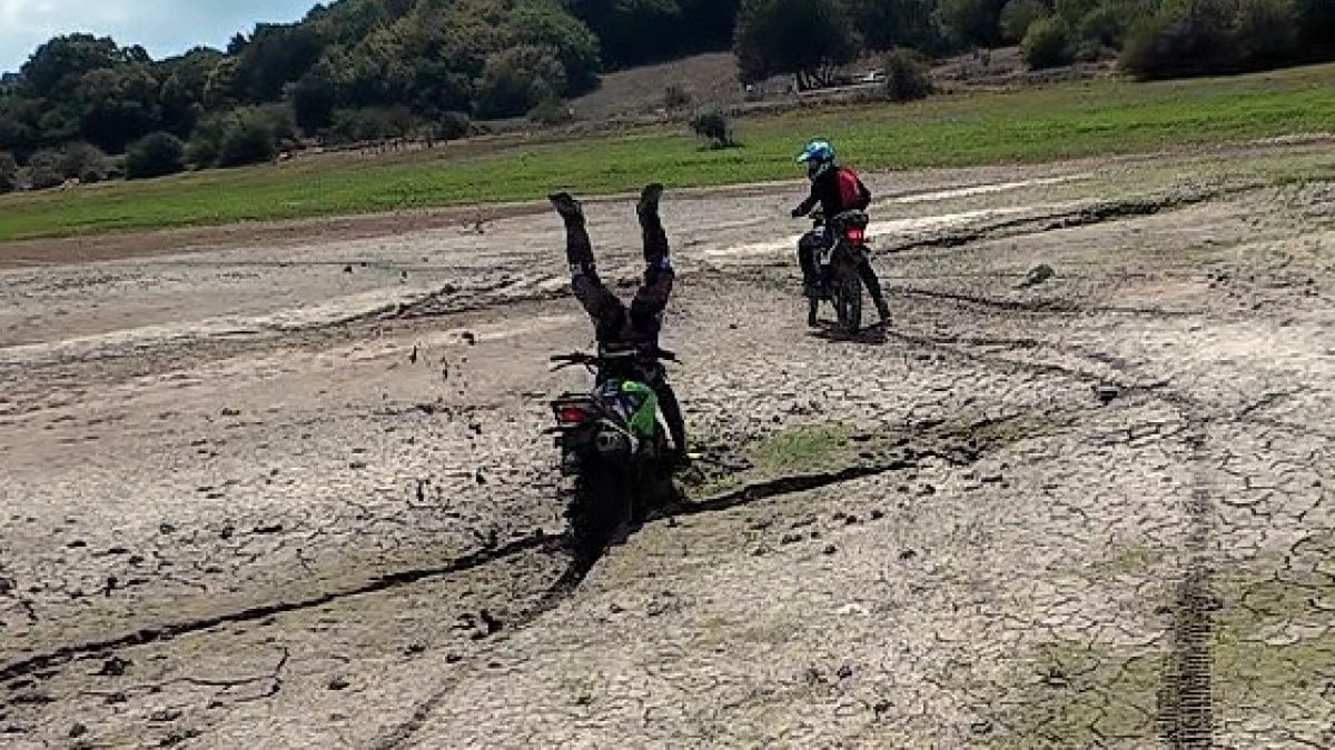 Gölün çekildiği bir noktada oluşan çamur yığını fark etmeyen sürücü Tanay Tanyar, motosikletinin çamura saplanması sonucu takla attı.