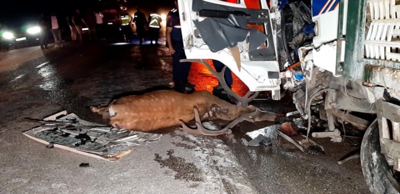 Mudurnu ilçesinde yola aniden fırlayan geyiğe çarptıktan sonra kamyonla çarpışan hafif ticari aracın sürücüsü Erol Y. hayatını kaybederken kamyon şoförü ise kazayı yaralanarak atlattı.