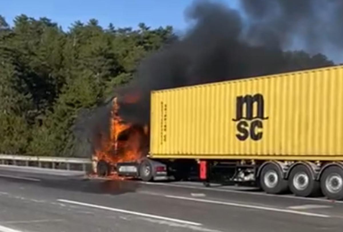 Bolu'da TEM Otoyolu’nun Cankurtaran mevkiinde Ankara yönünden İstanbul istikametine seyreden bir tır, henüz bilinmeyen bir nedenle yanmaya başladı.