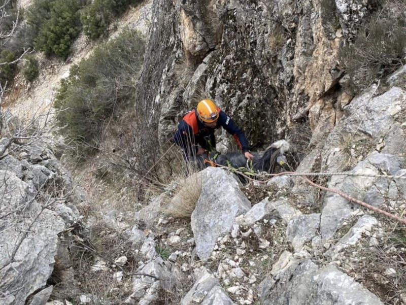 Ekipler, zorlu arazi şartlarına rağmen keçiye ulaşabilmek için dikkatli bir şekilde çalışmalarını sürdürdü.