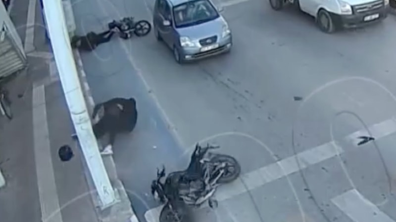 Görüntülerdeki birinci kazada hatalı geçiş yapan motosiklet sürücüsü seyir halinde olan başka bir motosikletle çarpışıyor.