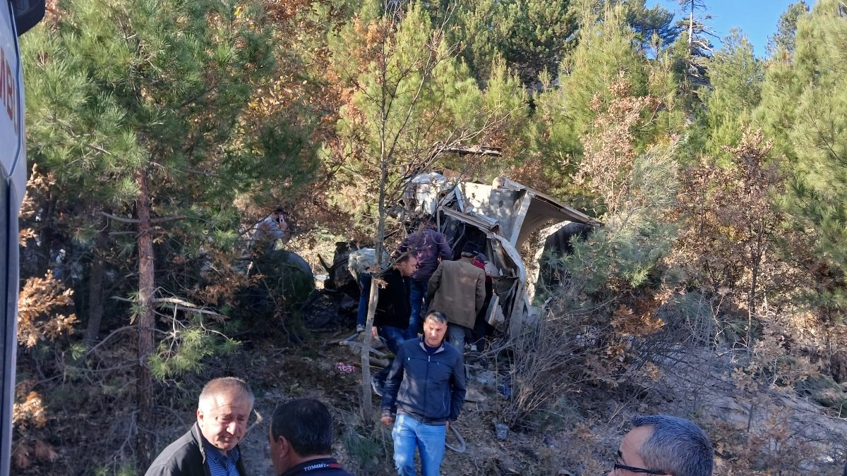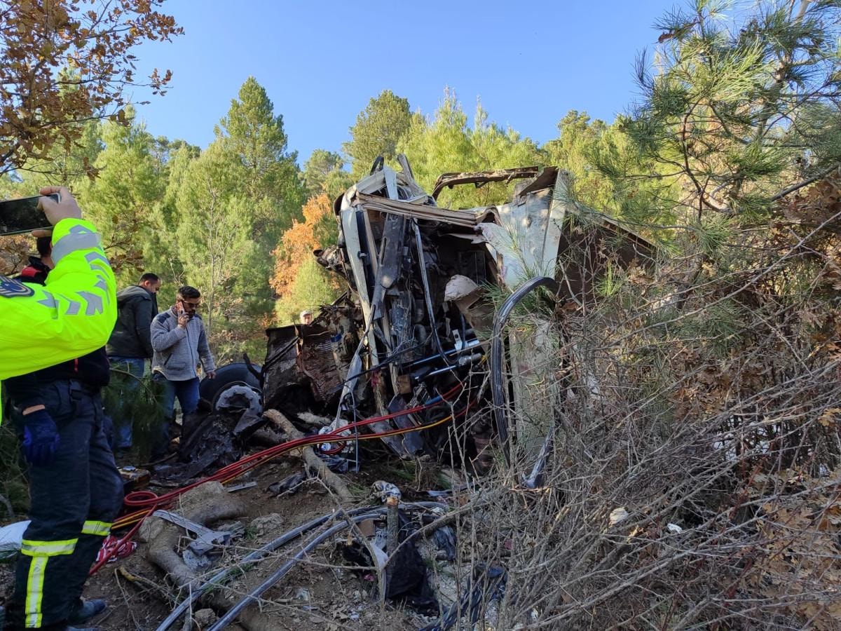 Çam ağaçlarını devirerek yaklaşık 40 metre yükseklikteki uçurumdan aşağı düşüp devrilen kamyon hurdaya dönerken sürücü ise araç içerisinde sıkışarak ağır yaralandı.