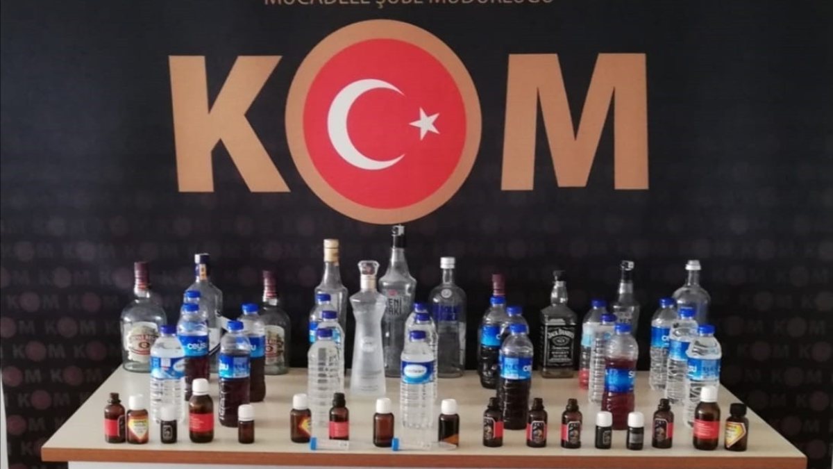 Aramalar neticesinde 31 litre ev yapımı içki, 10 litre etil alkol ile kaçak içki yapımında kullanılan 2 adet alkol kontrol test aparatı, 4 şişe aroma kiti ve doldurulmaya hazır 23 boş alkol şişesi ele geçirildi.