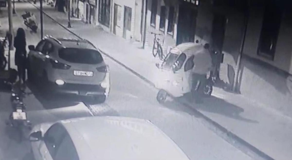 kaldırımda park halinde olan üzeri kapalı 3 tekerlekli elektrikli motosikletine binip kaldırımdan inmek isteyen bir vatandaş, karşı kaldırımda bulunan otomobil nedeniyle dönemedi.