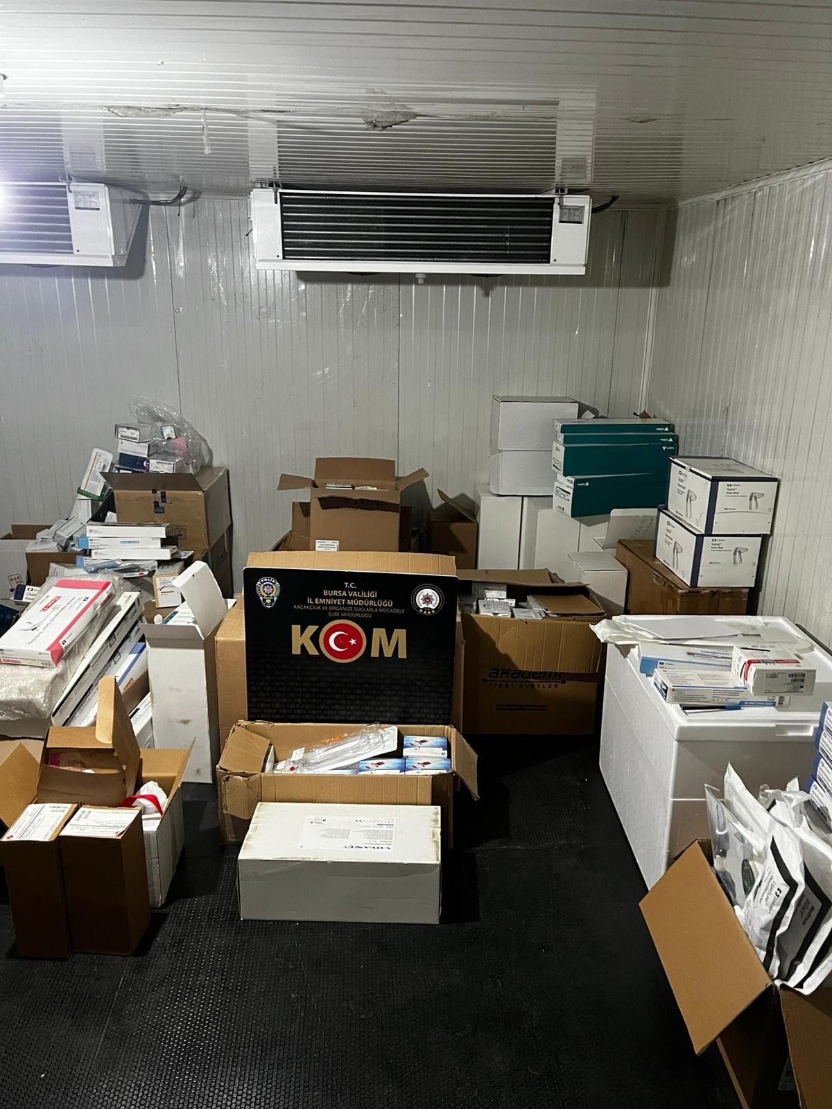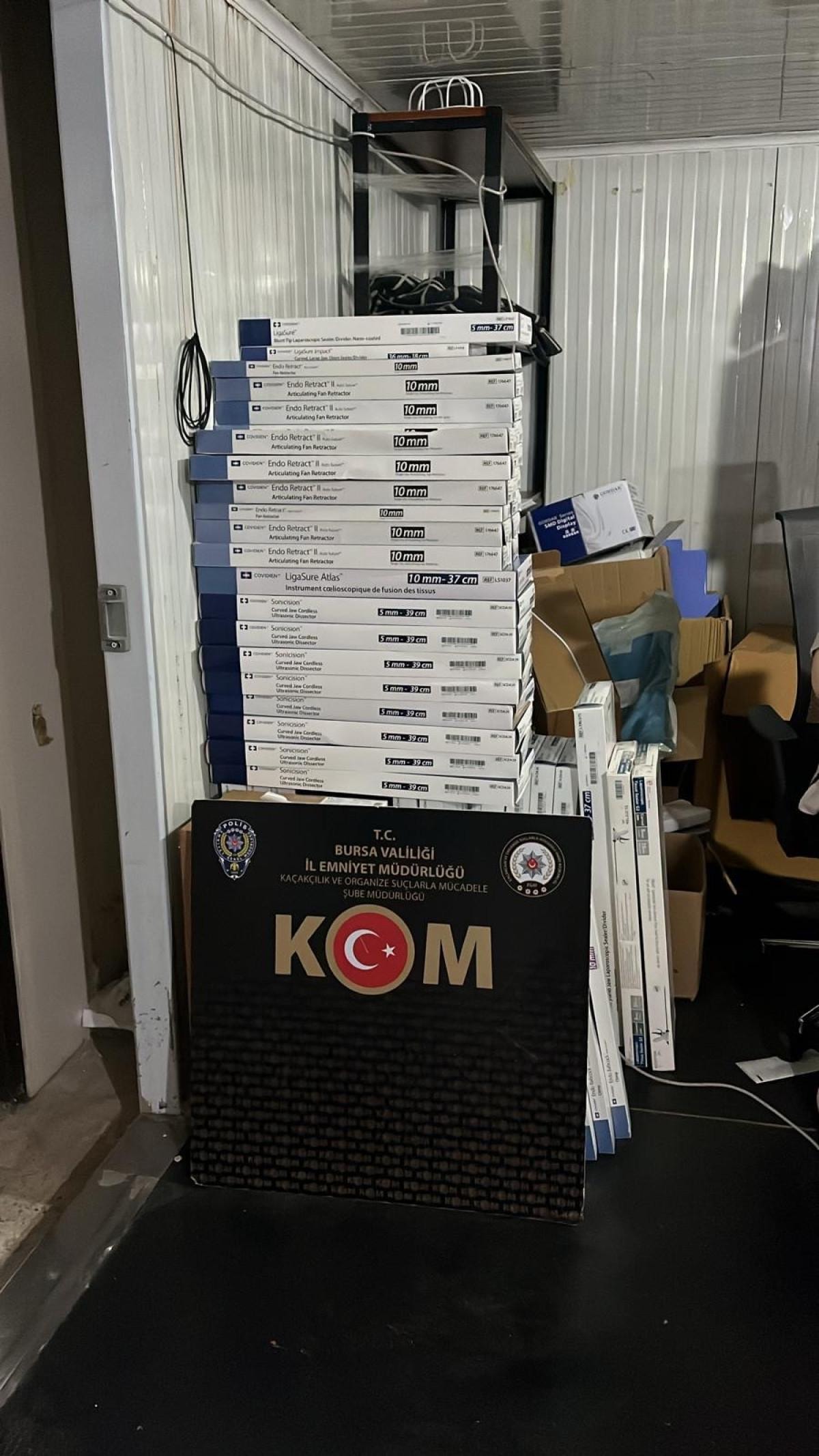 Şüphelilerin depo olarak kullandığı iş yerinde yapılan aramada Bursa Şehir Hastanesi’ne ait olduğu tespit edilen, 20 milyon TL değerinde tıbbi medikal malzeme ele geçirildi.
