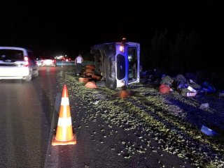 Kontrolden çıkan kamyonet yan yattı. Kilosu 30 lira olan yaklaşık 1 ton bamya yola savrulurken, kaza sonucu 5 kilometre araç kuyruğu oluştu.
