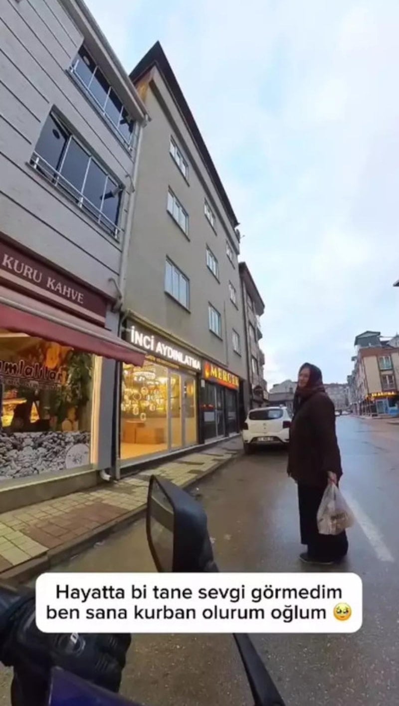 Motosikletlinin, 'Ben de sana kurban olurum' sözü üzerine geri dönüp sohbet eden kadının, 'Hayatta bir tane sevgi görmedim. Ben sana kurban olurum oğlum. Benim yaşım gelmiş 70'e, ölsem ne olur. Ama bana vurmazsan Allah insan yerine yazar seni' demesi dikkat çekmişti.