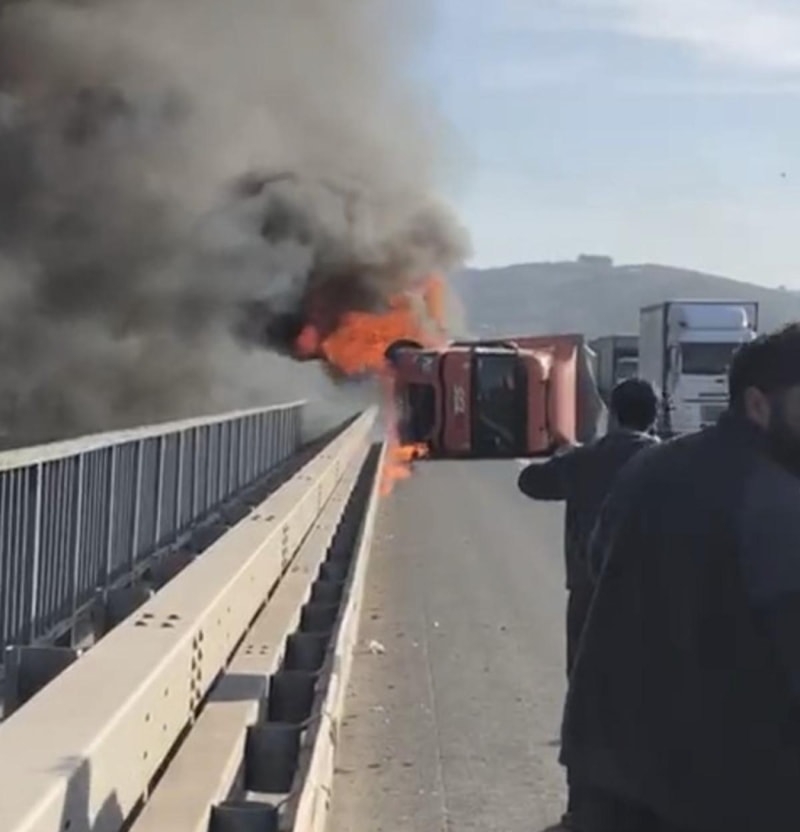 Bursa'da yan yatan tır alev alev yandı. Zaman zaman yaşanan patlamalar korku dolu anlar yaşattı. Şoförün tırdan kurtulma anları saniye saniye kameraya yansıdı.