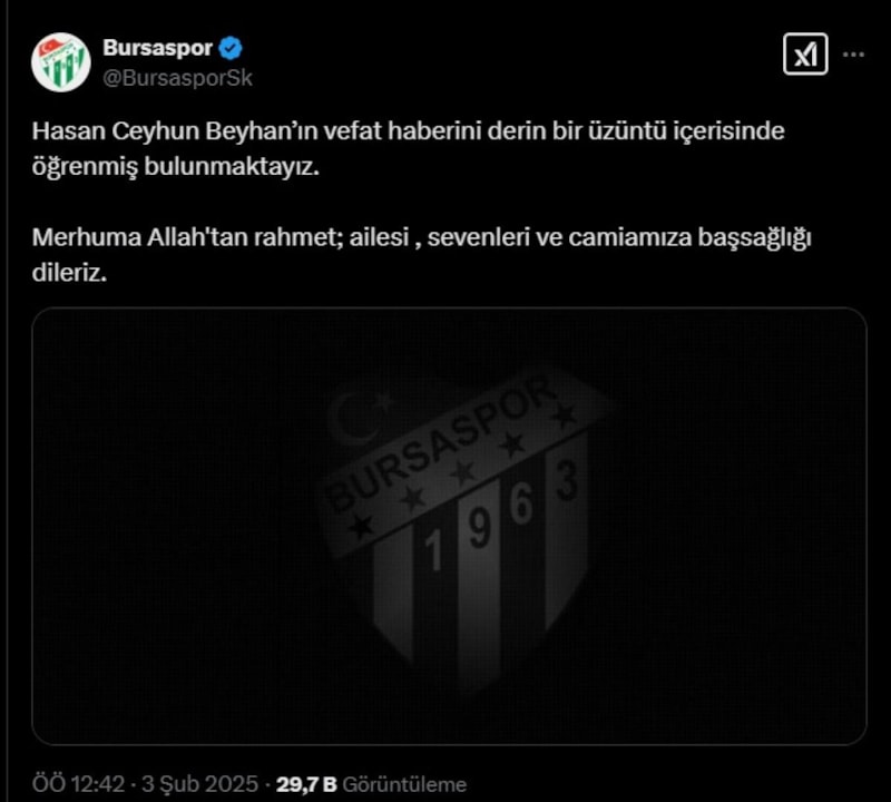 Hasan Ceyhun Beyhan’ın ölümünün ardından fanatik taraftarı olduğu Bursaspor’un sosyal medya hesabından da baş sağlığı mesajı yayınlandı. Mesajda, “Hasan Ceyhun Beyhan’ın vefat haberini derin bir üzüntü içerisinde öğrenmiş bulunmaktayız. Merhuma Allah'tan rahmet; ailesi, sevenleri ve camiamıza başsağlığı dileriz.” denildi.