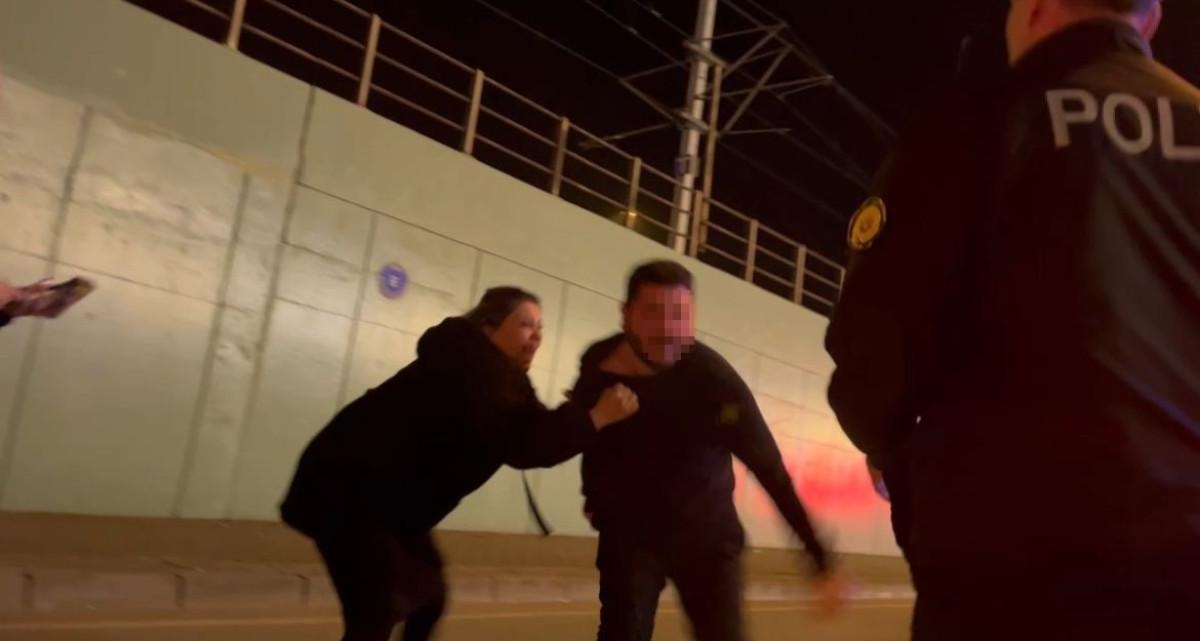 Alkollü sürücünün yanında bulunan kadın sürücü sürücüyü kolundan tutarken polis ekiplerine "Sizi dövmesin diye tutuyorum" ifadelerini kullandı.