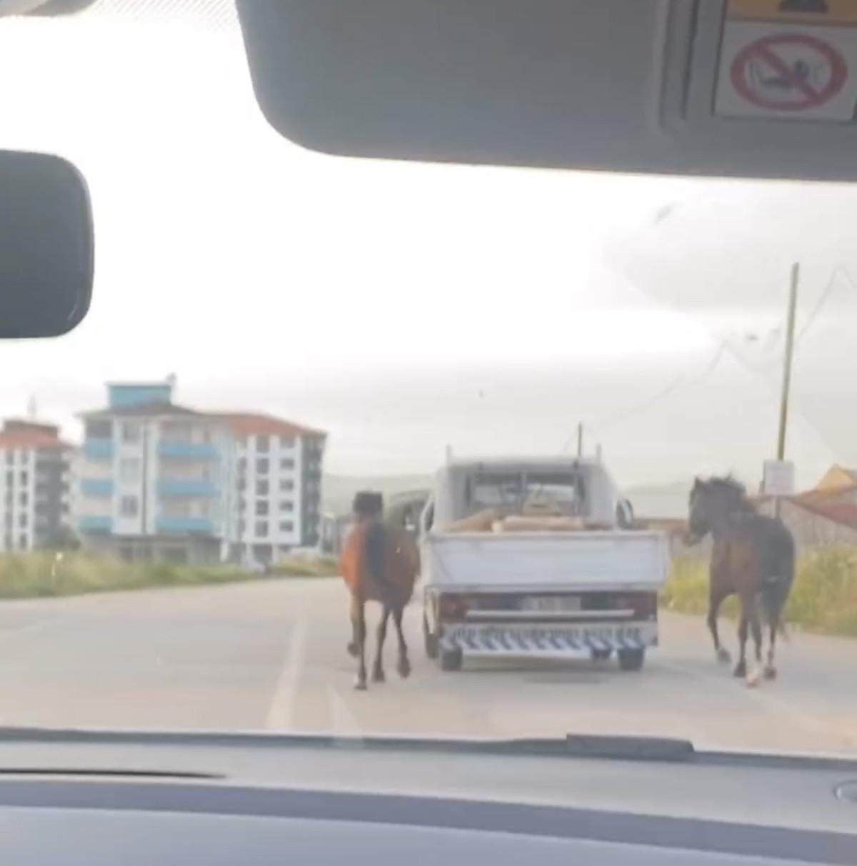 Bursa-Yenişehir Yolun’da kasalı aracıyla aracıyla yola çıkan bir sürücü, 2 atı iple kamyonetin arkasına bağladı.