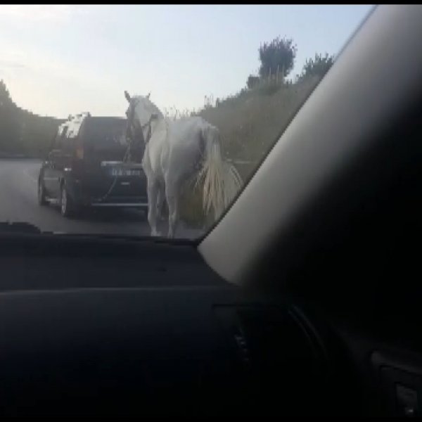 Bursa'nın İnegöl-Oylat yolunda bir sürücü, atı araca iple bağlayıp yola çıktı.