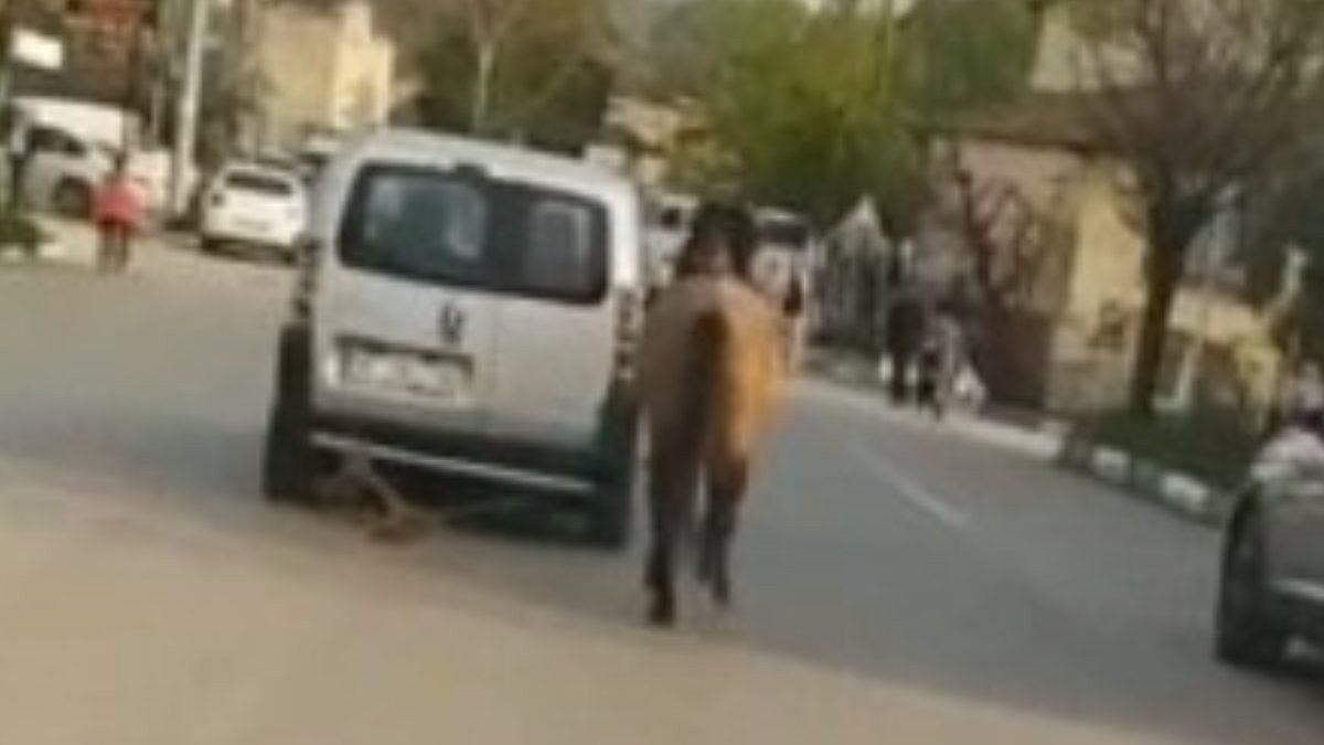 Bursa'nın Nilüfer ilçesi Akçalar Mahallesi'nde bir vatandaş, atını aracına bağlayarak kilometrelerce koşturdu.