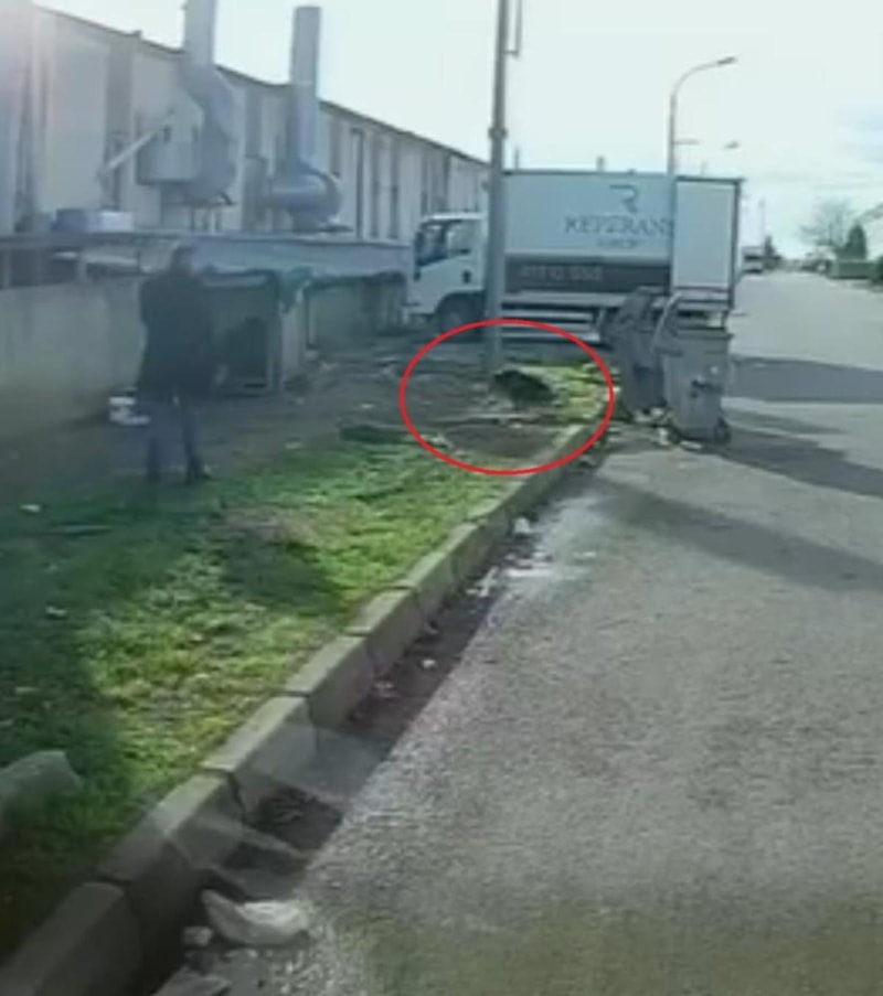 Bursa’nın Nilüfer ilçesi Nilüfer Organize Sanayi Bölgesinde bir kişi, caddede yürüdüğü esnada yol kenarındaki köpeği fark etmedi.