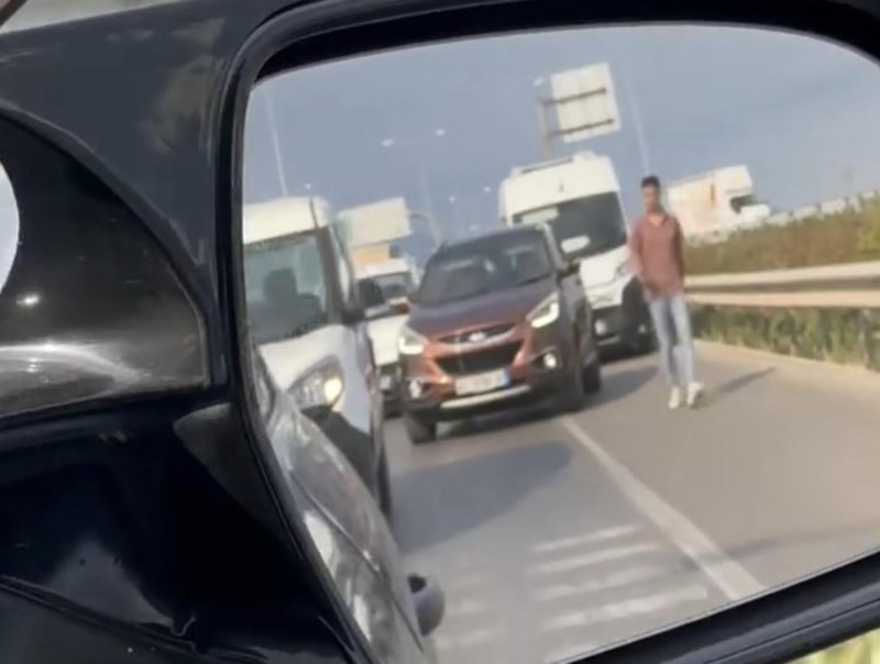 Bunu gören bir vatandaş ise, bulunduğu araçtan inerek emniyet şeridinden yürümeye başladı.