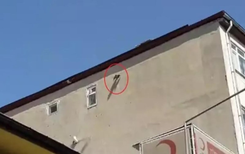 Gemlik ilçesinde 4 katlı binanın çatısından sarkan ipe dolanıp mahsur kalan karga, itfaiye ekiplerince kurtarıldı