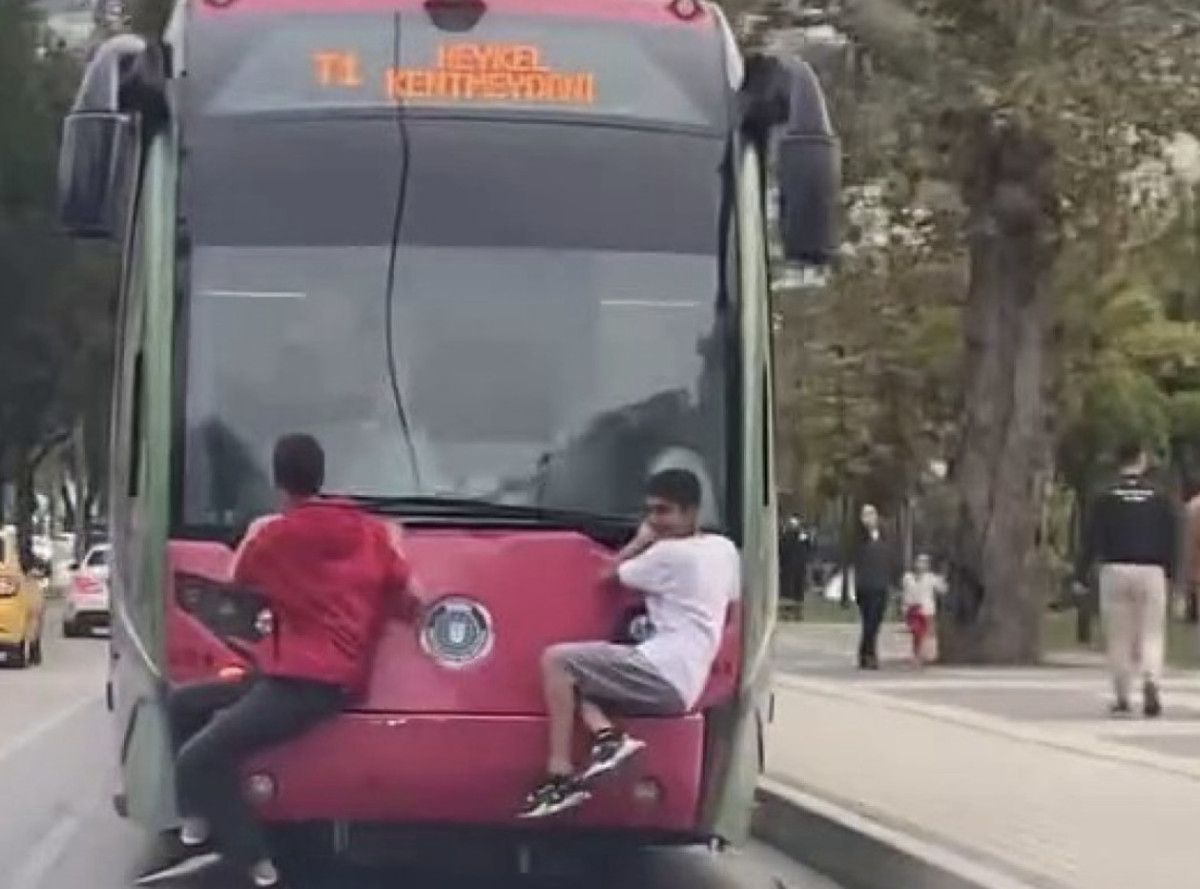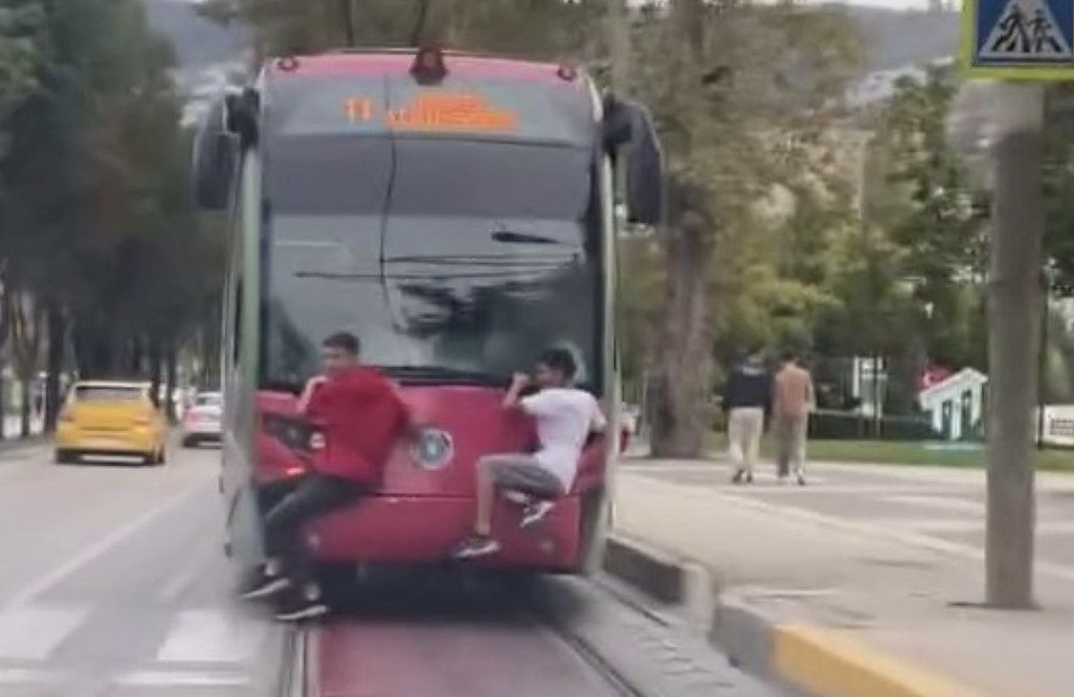 - Bursa Osmangazi'de iki çocuk, seyir halindeki tramvayın arkasına tutunarak tehlikeli bir yolculuk yaptı.