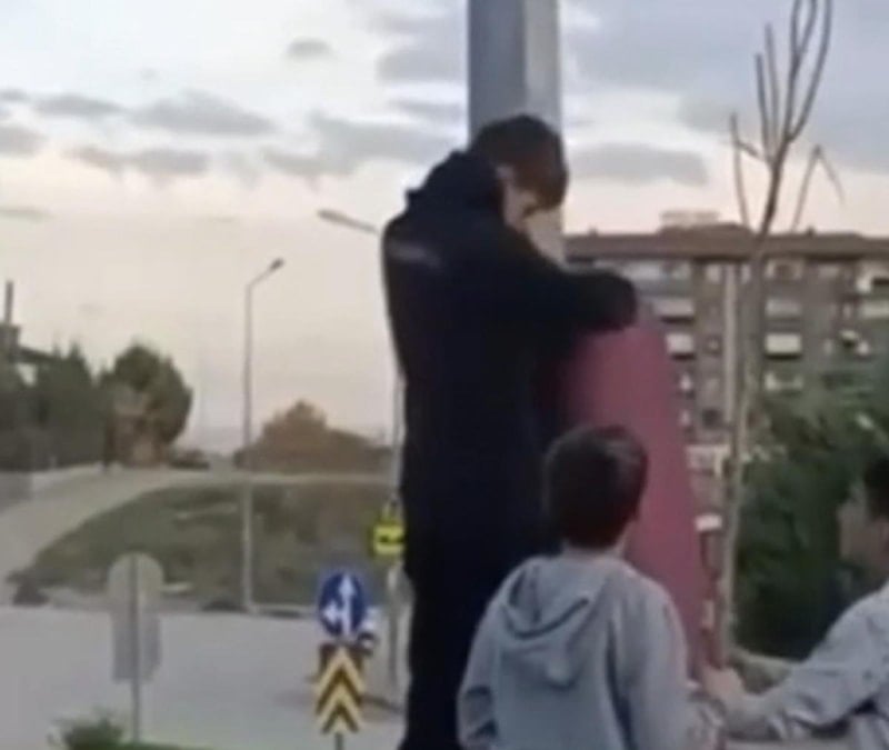 Bursa'da sokaktan geçen üç çocuk, direkteki Türk bayrağının rüzgârın etkisiyle tamamen katlandığını görünce hemen harekete geçti.