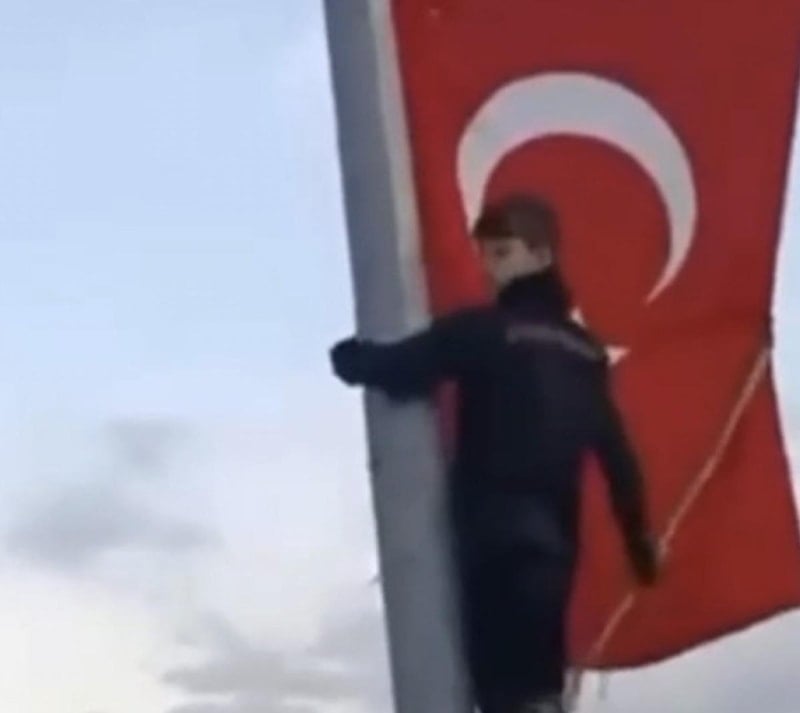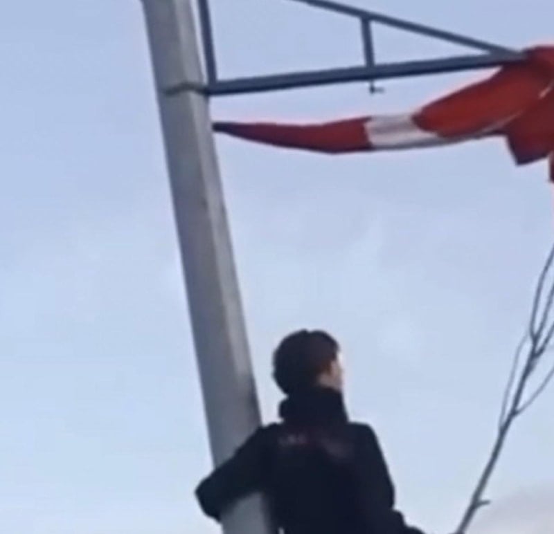 Birkaç denemenin ardından bayrağı başarılı şekilde açan çocuklar, Türk Bayrağı'nın yeniden gururla dalgalanmasını sağladı.