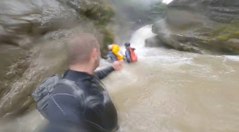 Görüntülerde, ekip üyesi İbrahim Taşçı’nın tutunduğu halat yardımıyla dereden son anda çıktığı ve sonrasında da arkadaşlarına gülümsediği anlar da yer aldı.