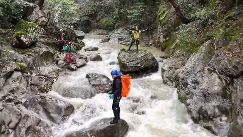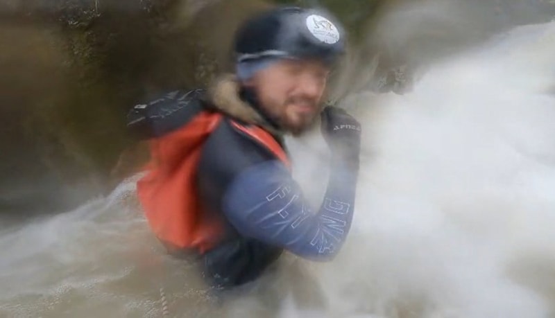 Orhangazi ilçesinde doğa yürüyüşüne çıkan dağcıların, yağışlarla birlikte su seviyesi yükselen dereden geçerken yaşadığı zor anlar, kask kamerasına yansıdı.