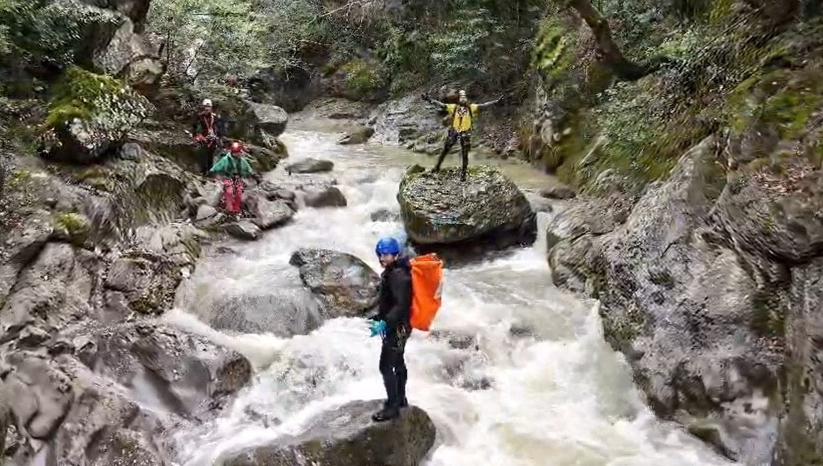 - Bursa'nın Orhangazi ilçesinde yürüyüş yapan dağcı ekip, Sölöz Kanyonu'nda su seviyesi yükselen dereyi geçmeye çalıştı.