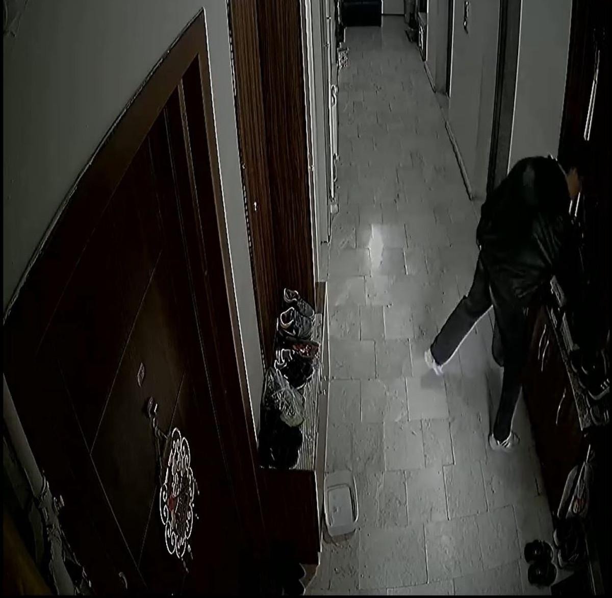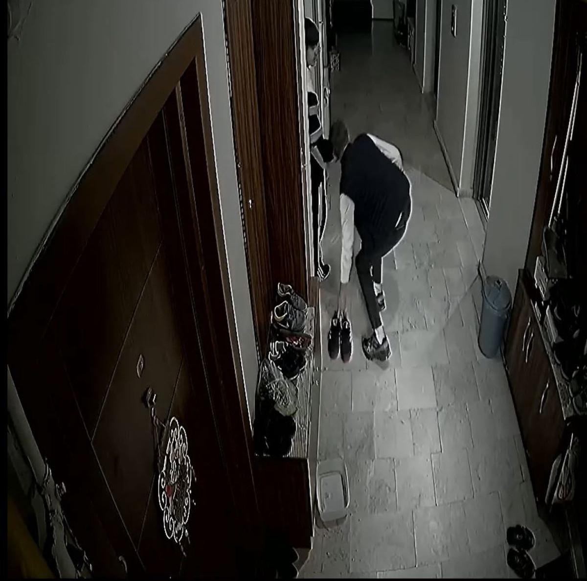 Aldıkları ayakkabıyı bırakan şüpheliler kaçarken, o anlar, apartmanın güvelik kamerasına yansıdı. Görüntülerde, apartmanda dolaşan 2 şüphelinin merdiveni kullanarak üst kata çıktığı, bir çift ayakkabıyı aldıktan sonra, aynı daire önünden ikinci ayakkabıyı almaya çalıştığı sırada, asansörden inen apartman sakinini görüp, koşarak merdivenlerden kaçtığı görüldü.