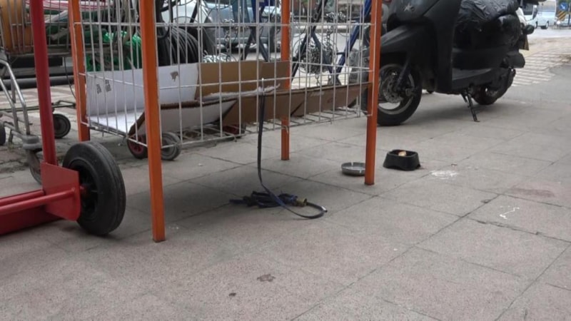 Bursa'da bir kadın, hava alsın diye dükkanın önüne bağlanan köpeği önce sevdi sonra çaldı.