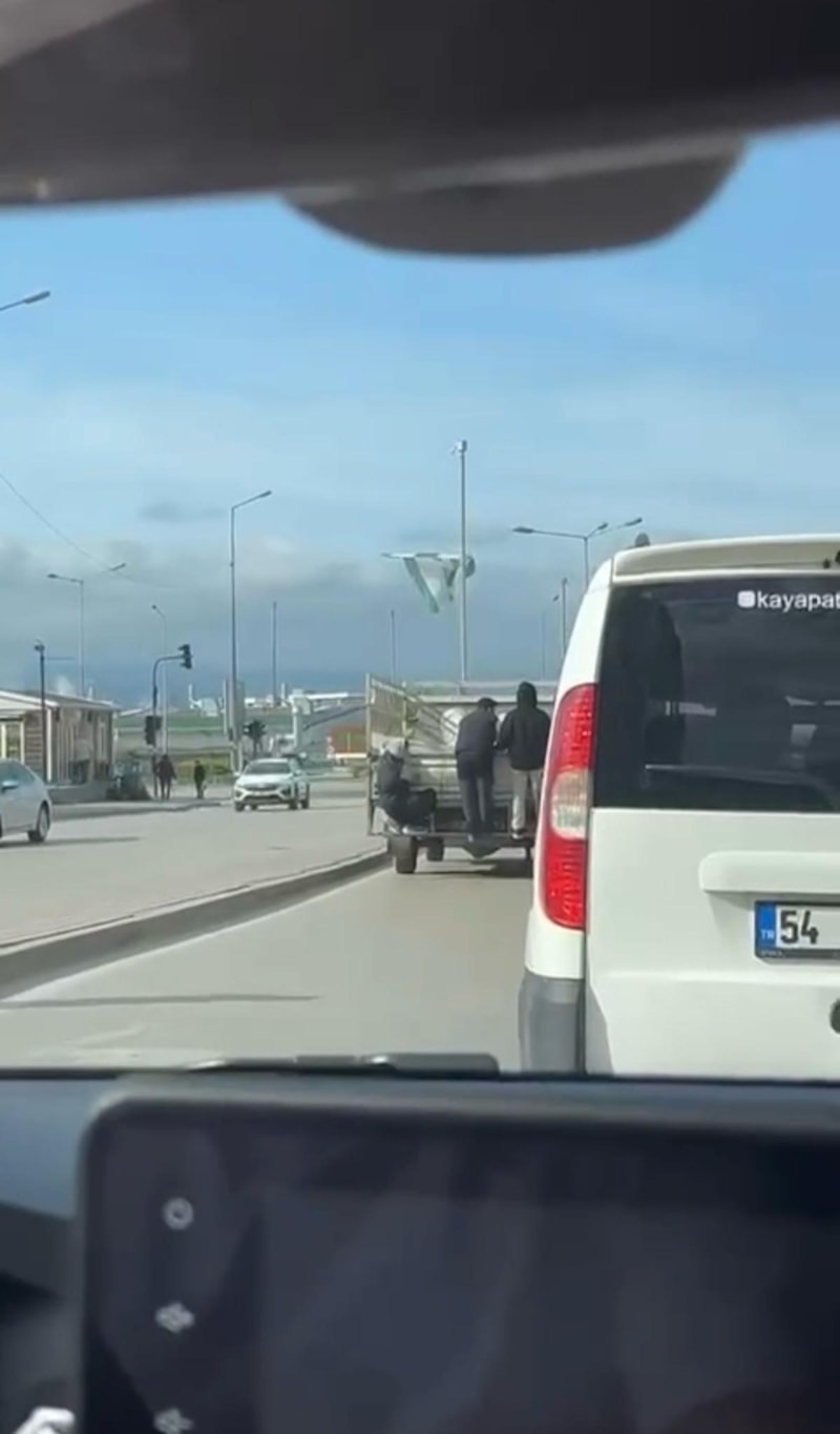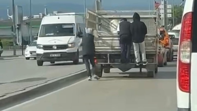 Cadde üzerinde seyreden açık kasa bir kamyonetin arkasına 3 genç tutundu.