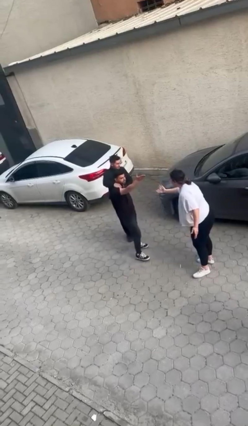 Saniyeler içinde çekilen görüntülerde kadının, kavga eden şahısları durdurmaya çalışırken güçlükle engellemeye çalıştığı görüldü.