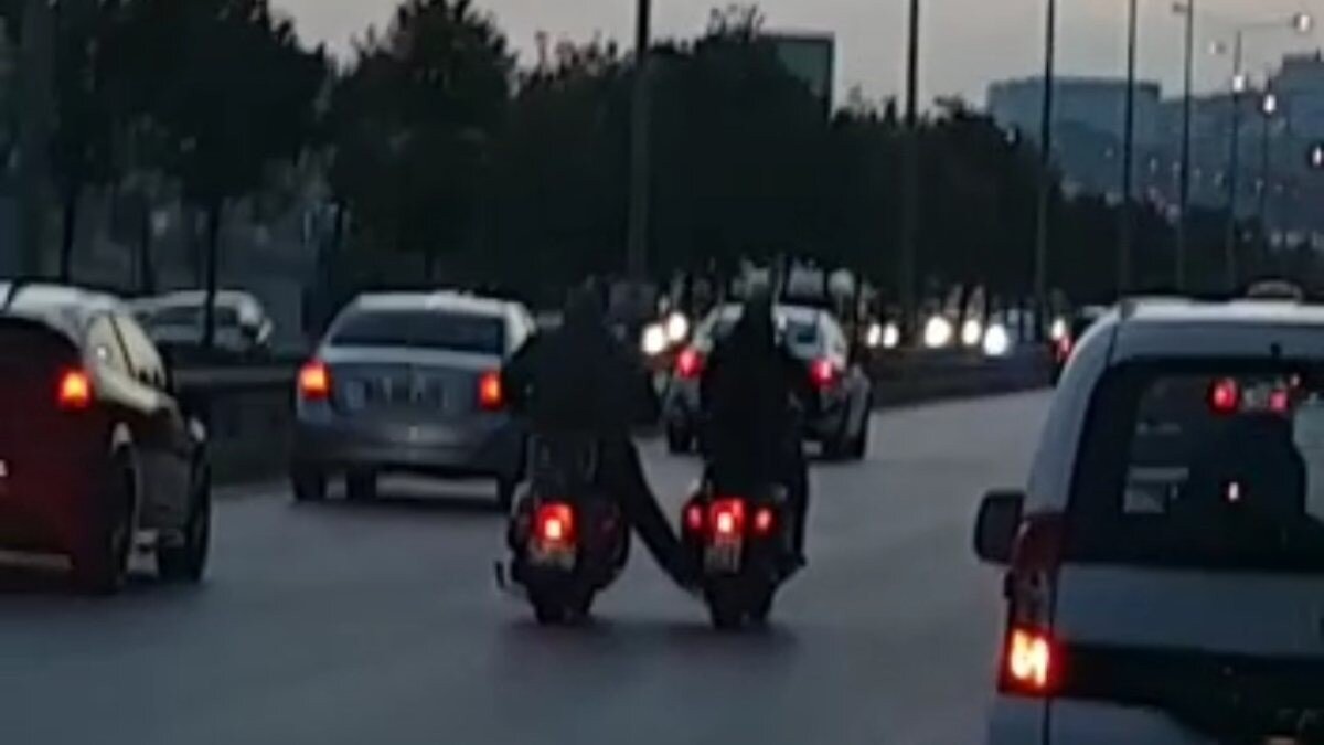 Ana yol üzerinde bir motosikletlinin ayağını diğer motosiklete koyarak ilerlediği görüldü.