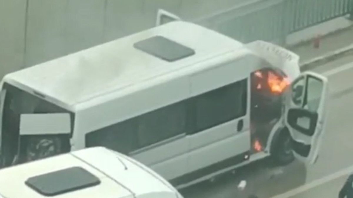 Bursa'nın Osmangazi Mahallesi Mudanya Yolu Caddesi’nde işçi taşıyan servis aracı, seyir halindeyken bir anda alev aldı.