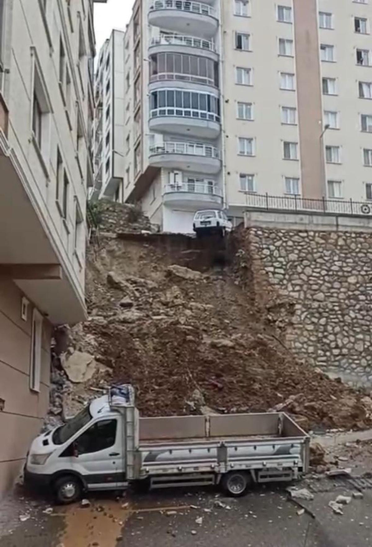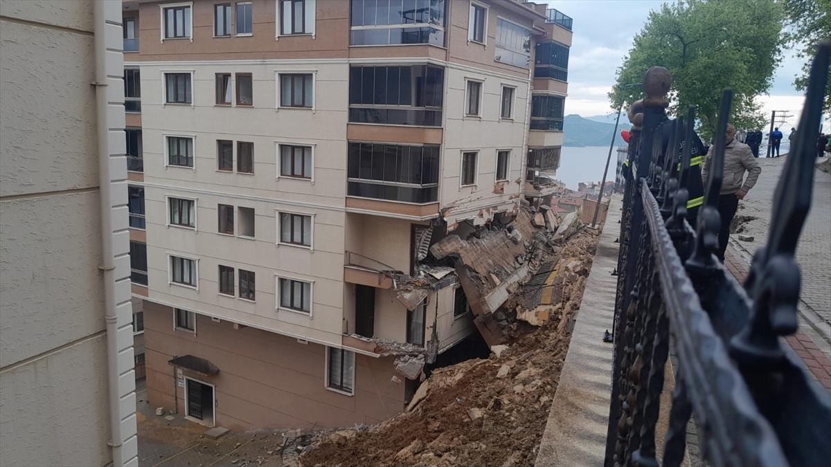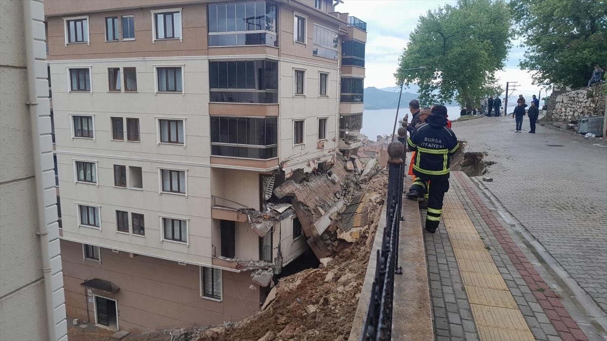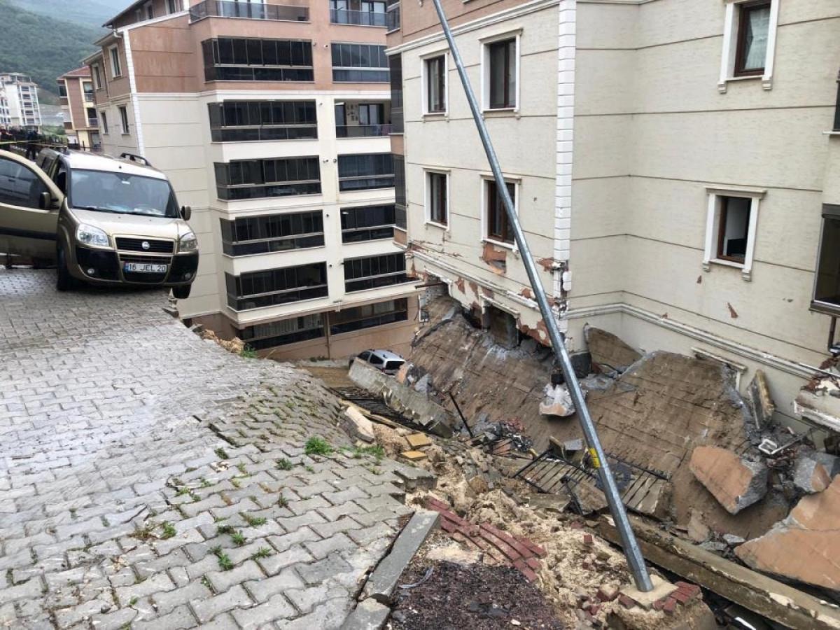 Bu sabah Bursa'nın Gemlik ilçesine bağlı Yeni Mahalle Şehit Mehmetçik Sokağı'nda şiddetli yağışın da etkisiyle zayıfladığı ileri sürülen istinat duvarı, kot farkı nedeniyle alt tarafta kalan 6 katlı apartmana doğru yıkıldı.